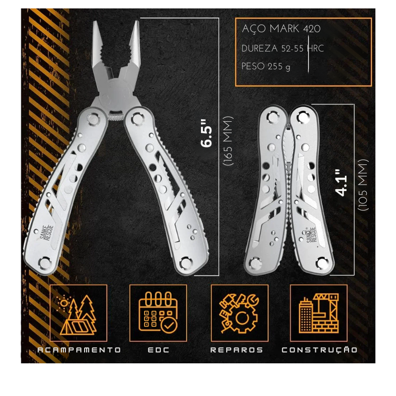 Feito em material metálico resistente, pensado para uso real, e não apenas enfeite. Ideal para quem precisa de uma ferramenta que aguente uso frequente: no trabalho, em casa, no carro ou em atividades outdoor.