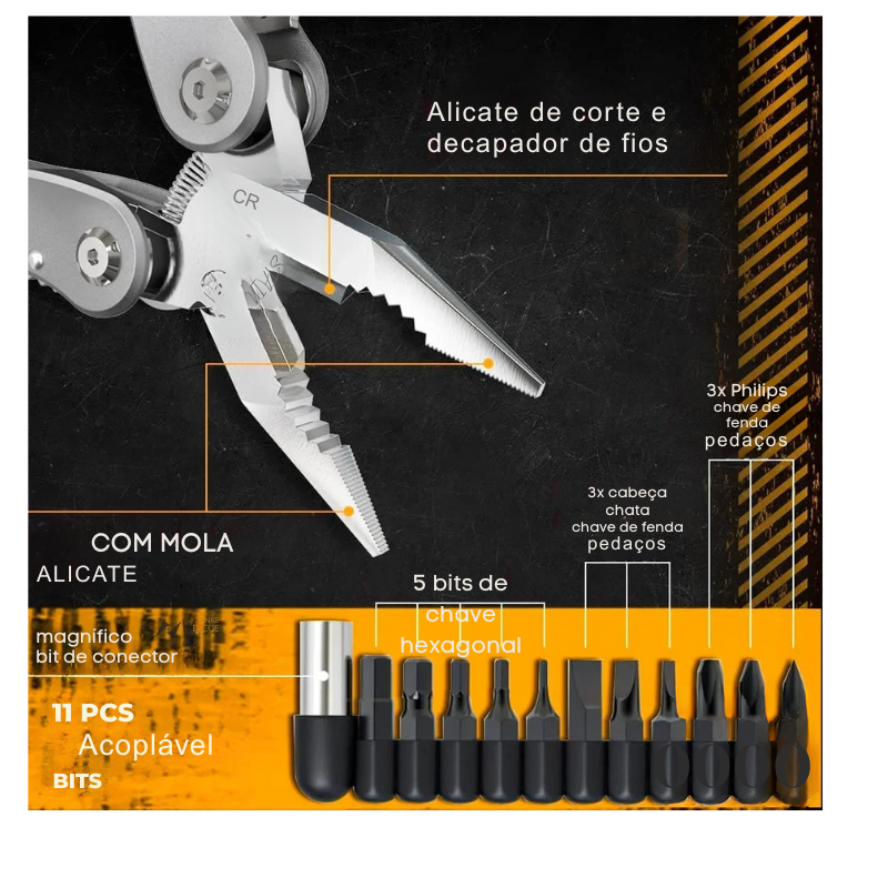 Alicate com mola, cortador e descascador de fio, serrilhado dobrável e faca de lâmina principal, abridor de latas e garrafas, lima de metal, chaves de fenda, 11 pontas acopláveis com conector magnético, raspador e furador.É uma verdadeira ferramenta utilitária multifuncional.