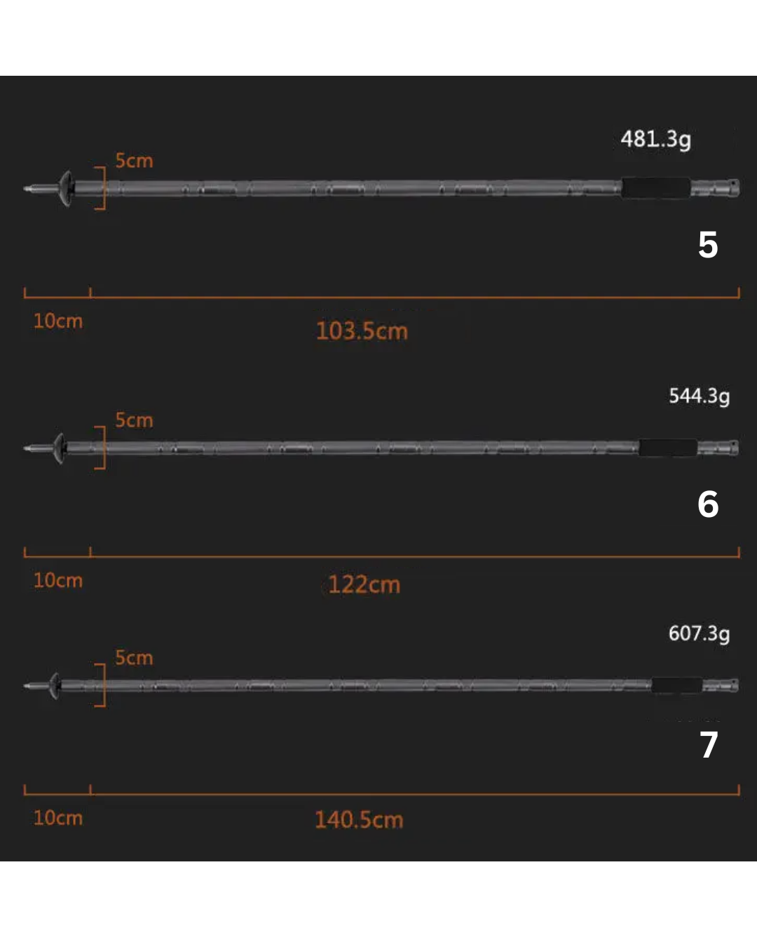 O bastão é composto por seções telescópicas (Seção 5, Seção 6, Seção 7), permitindo ajuste de altura conforme sua estatura e o tipo de terreno. Isso significa mais ergonomia, melhor postura e menos desgaste físico.