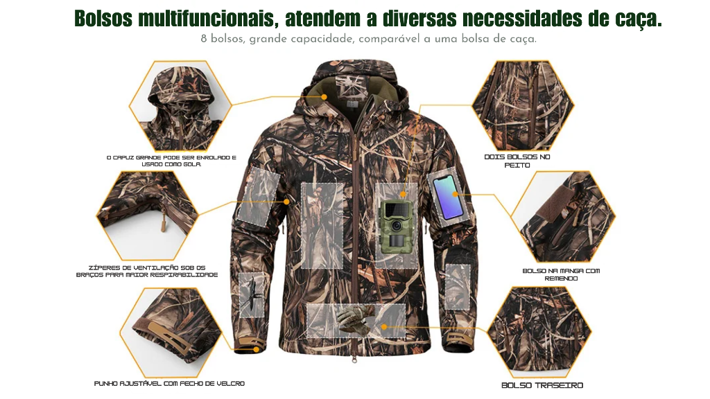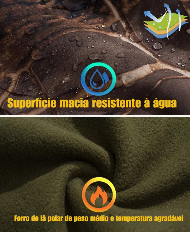 O grande diferencial deste modelo está na combinação de camuflagem estratégica + resistência climática, ideal para quem passa horas em ambiente externo e precisa de uma peça confiável. Em dias de chuva ou sereno, ela ajuda você a manter o corpo seco e protegido, reduzindo o desconforto e preservando sua energia ao longo do percurso. É o tipo de equipamento que faz diferença quando o tempo vira de surpresa.