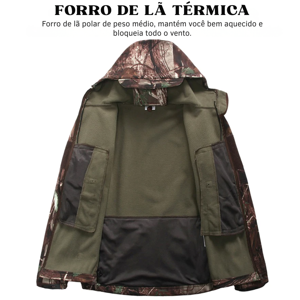 Porque ela resolve o problema mais comum de quem vive o outdoor de verdade: ser pego despreparado pelo clima. Em vez de depender de jaquetas comuns que encharcam rápido ou limitam seus movimentos, você ganha uma peça com proposta tática, feita para acompanhar o ritmo de quem não gosta de improviso.