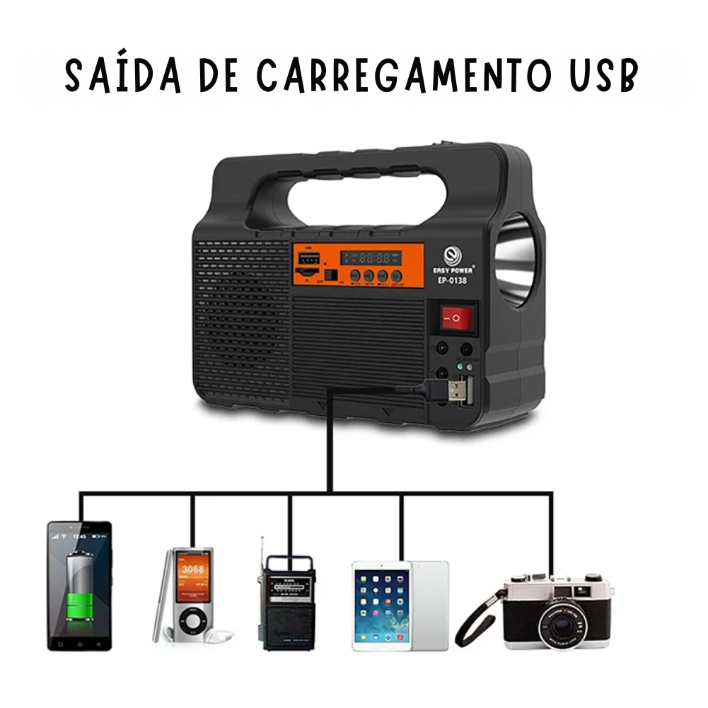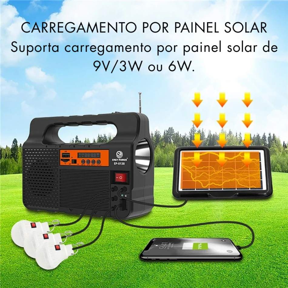 O Kit Gerador de Painel de Energia Solar Portátil com 3 Lâmpadas LED – EP-0138 é a solução prática e econômica para quem quer luz e autonomia sem depender da tomada. Seja para emergências em casa, quedas de energia, camping, sítio, barraca de pesca, viagens ou uso em áreas rurais, este kit entrega o essencial com simplicidade: captação solar + iluminação LED eficiente em um conjunto leve e fácil de transportar. ☀️🔋💡