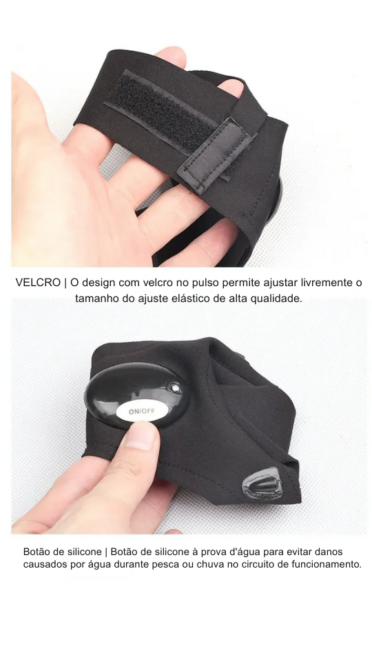 Disponível nas versões Mão direita e Mão esquerda, você escolhe o lado que usa com mais precisão – ou garante o par para ter o máximo de desempenho. Os LEDs ficam posicionados estrategicamente na região dos dedos, iluminando com foco a área em que você está trabalhando: amarrando anzol, mexendo em cordas, ajustando a barraca, trocando pneu, verificando motor do carro, mexendo em caixas de disjuntores, cadeados, fechaduras e muito mais.
