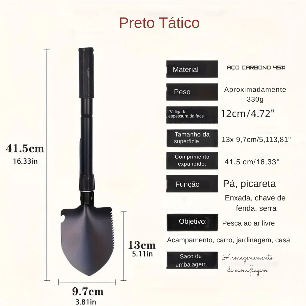 Imagine ter em um único equipamento uma pá funcional, com estrutura reforçada, acabamento na cor Preto super discreta e visual tático, que combina perfeitamente com mochilas, kits de emergência, bug out bag, porta-malas do carro e equipamentos de camping. Em vez de levar vários itens separados ocupando espaço, você leva apenas uma ferramenta inteligente, pensada para uso real em campo.