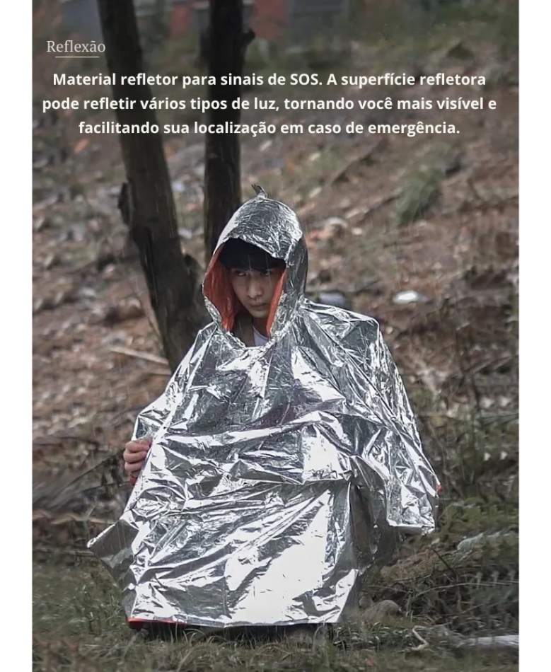 O Poncho Survival 2 em 1 é fabricado em material impermeável, ajudando a proteger contra chuva, vento e umidade. Basta abrir e vestir como um poncho para manter corpo e roupas mais secos, seja caminhando, acampando ou esperando a chuva passar. Já em situações de frio, vento forte ou emergência, ele pode ser utilizado como cobertor de sobrevivência, envolvendo o corpo e auxiliando na retenção do calor.