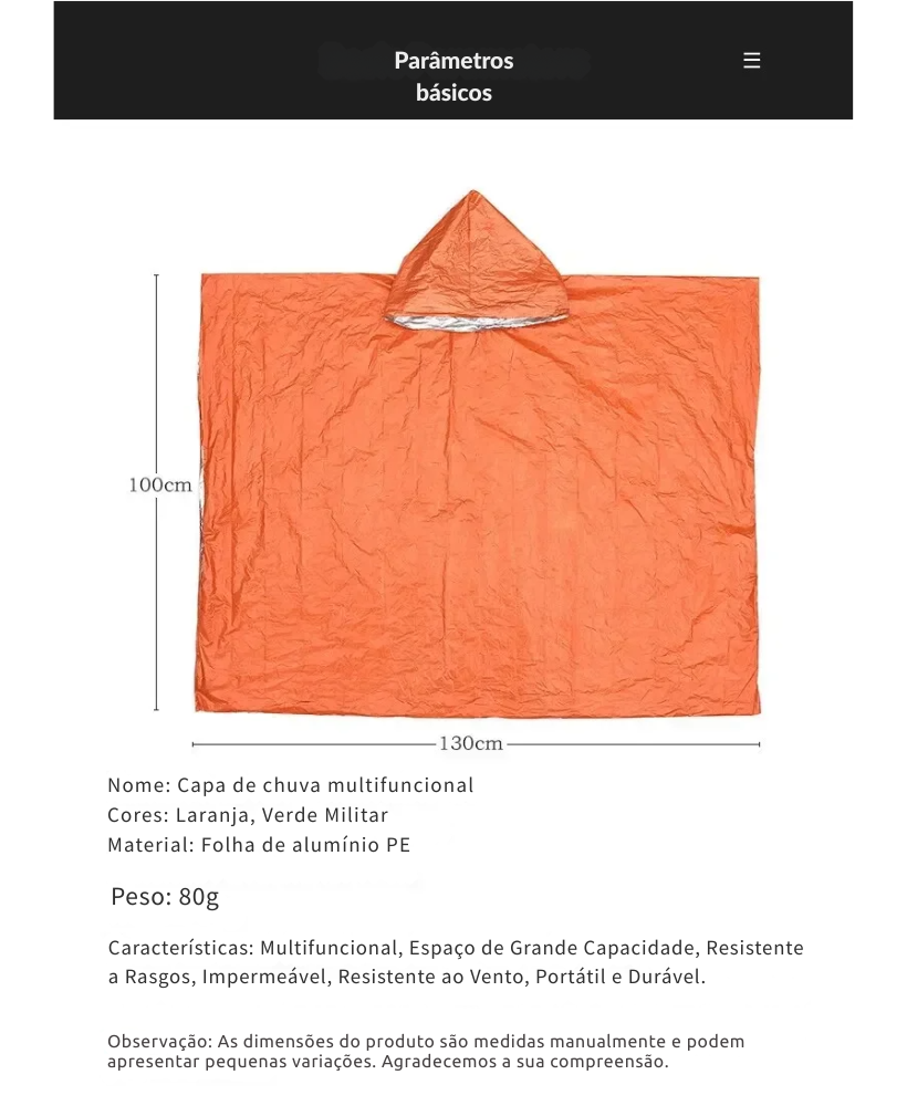 ✅ Adicione agora o Poncho Survival 2 em 1 – Capa de Chuva Impermeável e Cobertor de Emergência ao seu carrinho e esteja sempre um passo à frente, com mais proteção, conforto e segurança em qualquer situação ao ar livre.