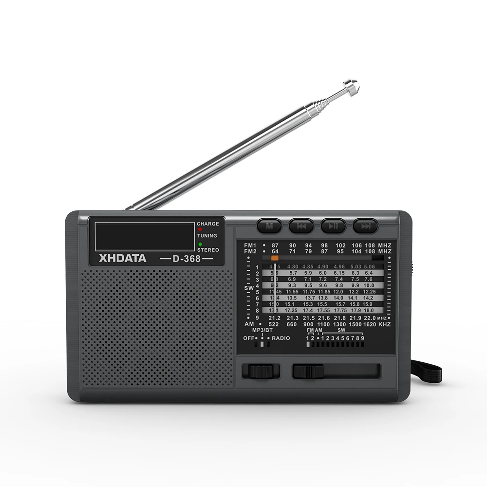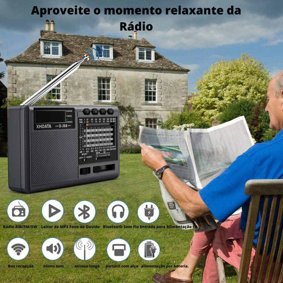 O XHDATA D-368 Rádio Portátil FM AM SW Ondas Curtas MP3 Player Estéreo com Entrada é a escolha perfeita para quem quer um rádio compacto, moderno e muito completo, com som limpo e muita versatilidade para o dia a dia. Seja para ouvir notícias, música, esportes, programações locais ou emissoras internacionais, o D-368 entrega uma experiência surpreendente em um corpo portátil, fácil de transportar e pronto para acompanhar você em qualquer lugar. 📻✨